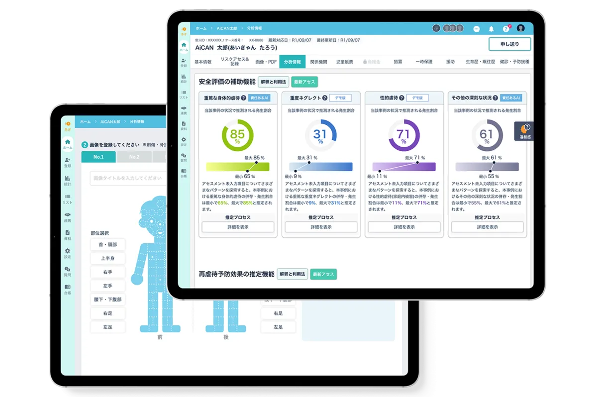 株式会社AiCANでは、これらの課題を解決するために業務支援アプリ「AiCAN」を導入しています。このアプリは、タブレット端末を用いて、児童相談業務の効率化やコミュニケーションのスムーズ化を実現するために設計されています。具体的には、移動中にスキマ時間を活用してデータを入力でき、チャット機能により職員間での情報共有が円滑になります。また、過去のデータをもとに、虐待のリスクが高い事例に対する優先的な調査項目を表示し、職員の判断をサポートします。