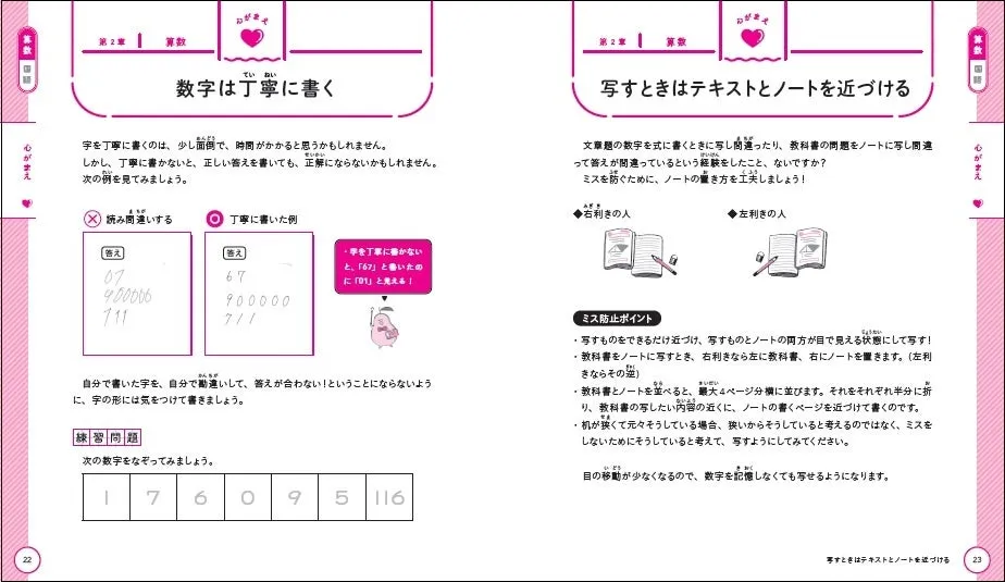 - - 算数部門では、数字を丁寧に書くことや写す際の注意が求められます。「くり上がり・くり下がり」や「約分し忘れ」といった、よくあるミスを克服するための問いが揃っています。