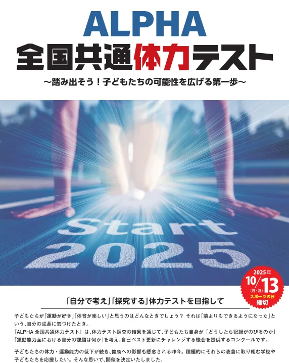 「ALPHA全国共通体力テスト」は、運動を楽しむ子どもたちが自身の可能性を広げるための舞台です。日々の努力が認められる機会を通じて、体力向上を目指して一緒に頑張りましょう!