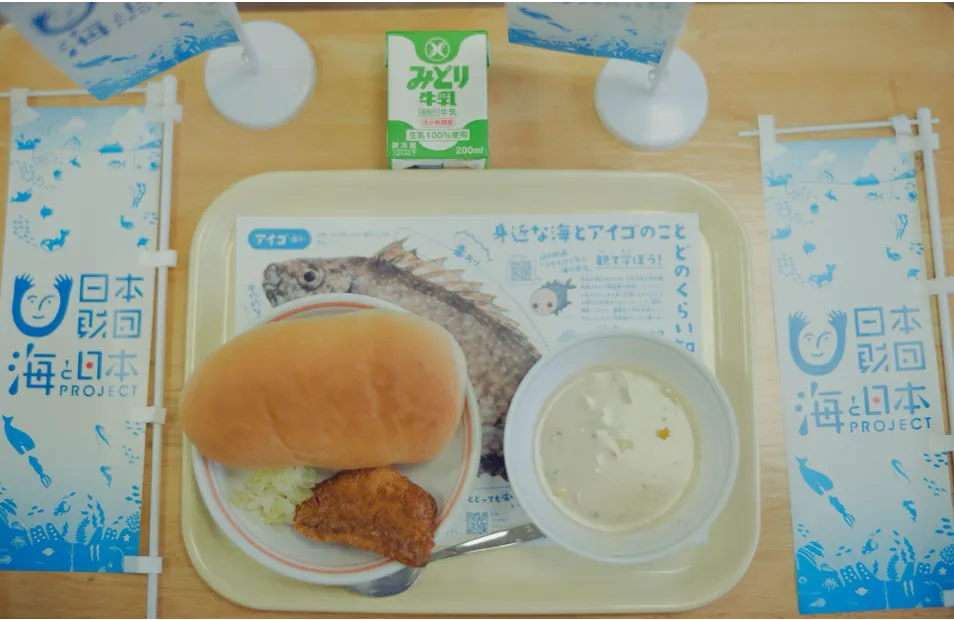 給食が提供された33校では、アイゴを使ったお料理が工夫されています。例えば、パンの日にはアイゴを挟んでフィッシュバーガーを作る生徒がいたり、ご飯の日には「アイゴ美味しい!」と笑顔で食べる姿が見られました。また、アイゴに関連する学びを深めるためのオリジナルランチョンマットが配布され、昨年度の事業で制作した『アイゴから学ぶ海の変化』という動画が流されました。食事を楽しむ中で、海についても学べるという贅沢な体験が得られました。