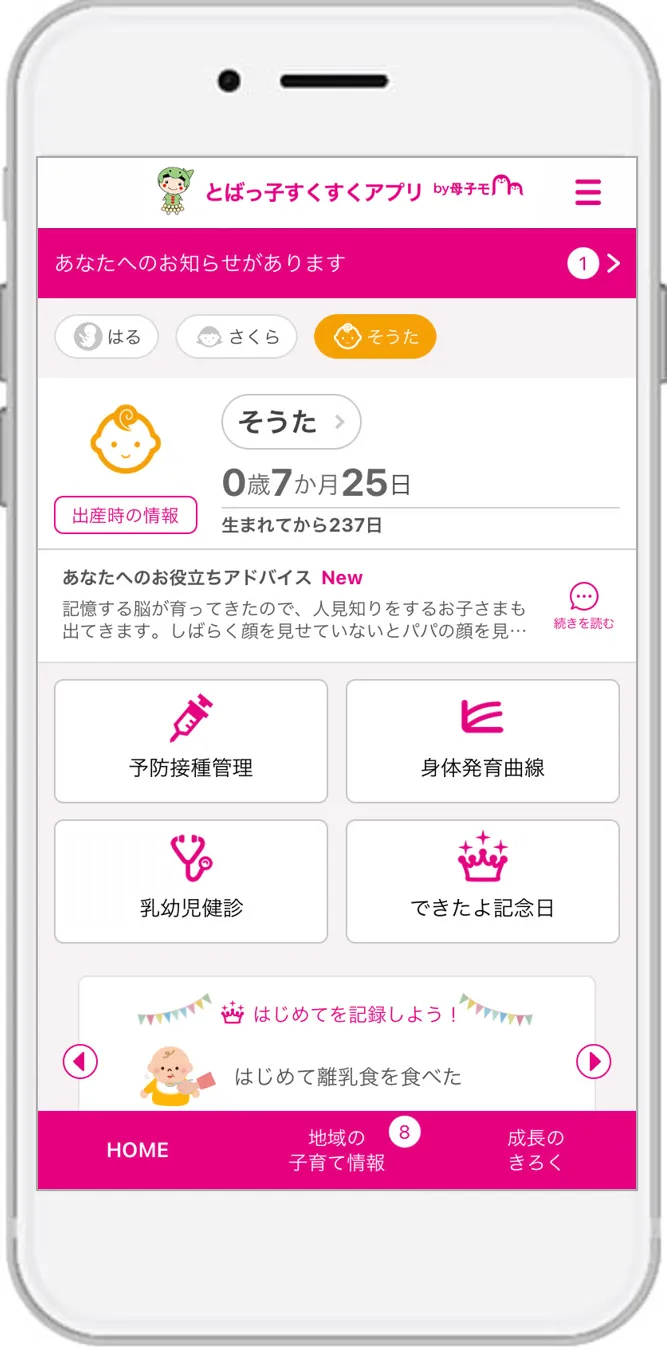 『とばっ子すくすくアプリ』では、妊産婦と子どもの健康データの管理だけでなく、育児に役立つ情報配信やアドバイス機能も充実しています。アプリには、育児日記としての役割も果たす「できたよ記念日」機能があり、子どもの成長を記録するだけでなく、保護者同士が交流するための場も提供します。このように家族や地域の支援をスムーズに行えることが、育児を行う上での大きな助けとなります。