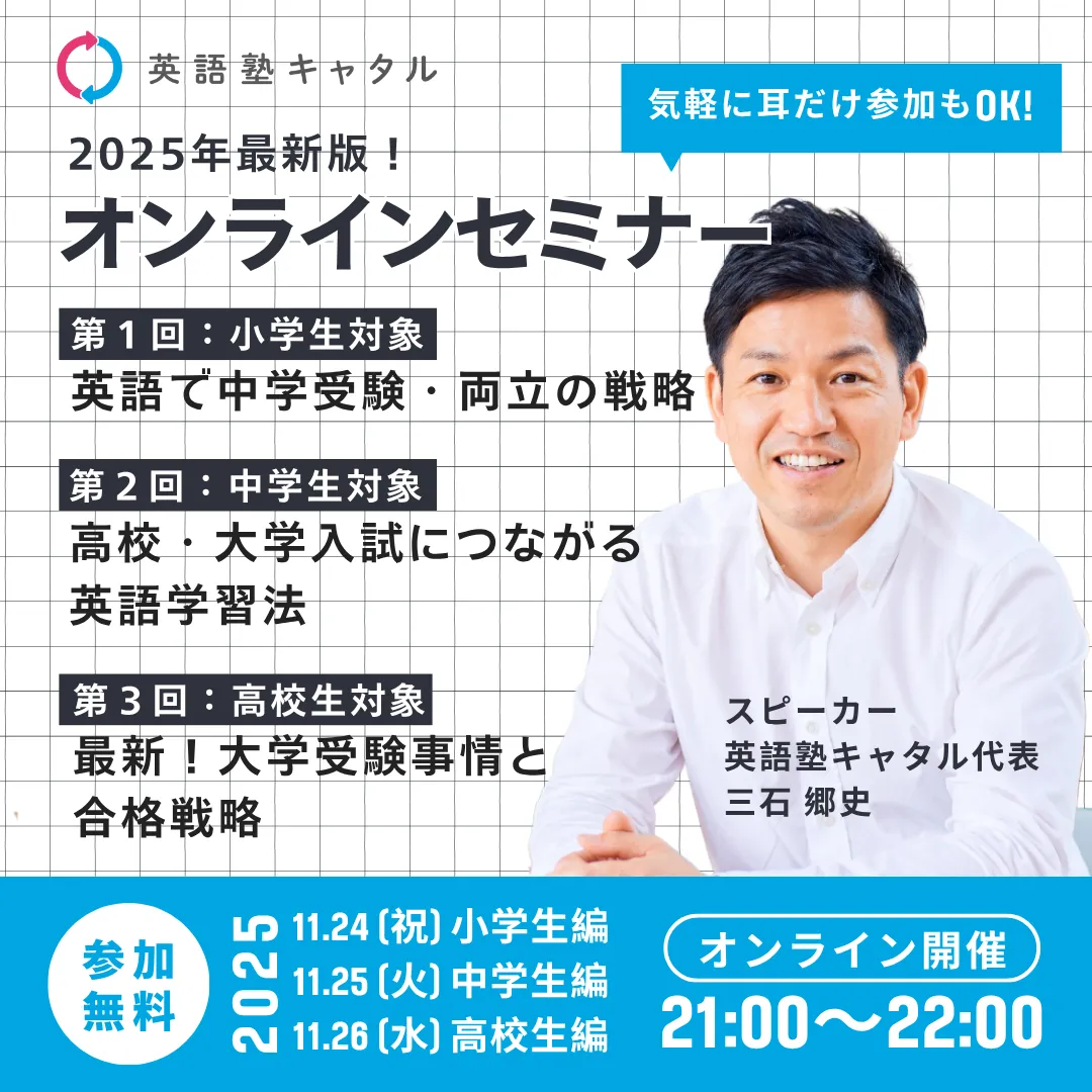 英語の学習は今や子どもたちの未来を左右する重要な要素となっています。しかし、どのように学ぶか、何を重視するかは個々の家庭次第。この11月、英語塾「キャタル」が開催する無料オンラインセミナーは、そんな保護者や学生にとって、未来への道筋を明確にする絶好のチャンスです。2025年11月24日から26日の3日間、各学年別に異なるテーマでオンラインセミナーが行われます。今回はその詳細をご紹介します。