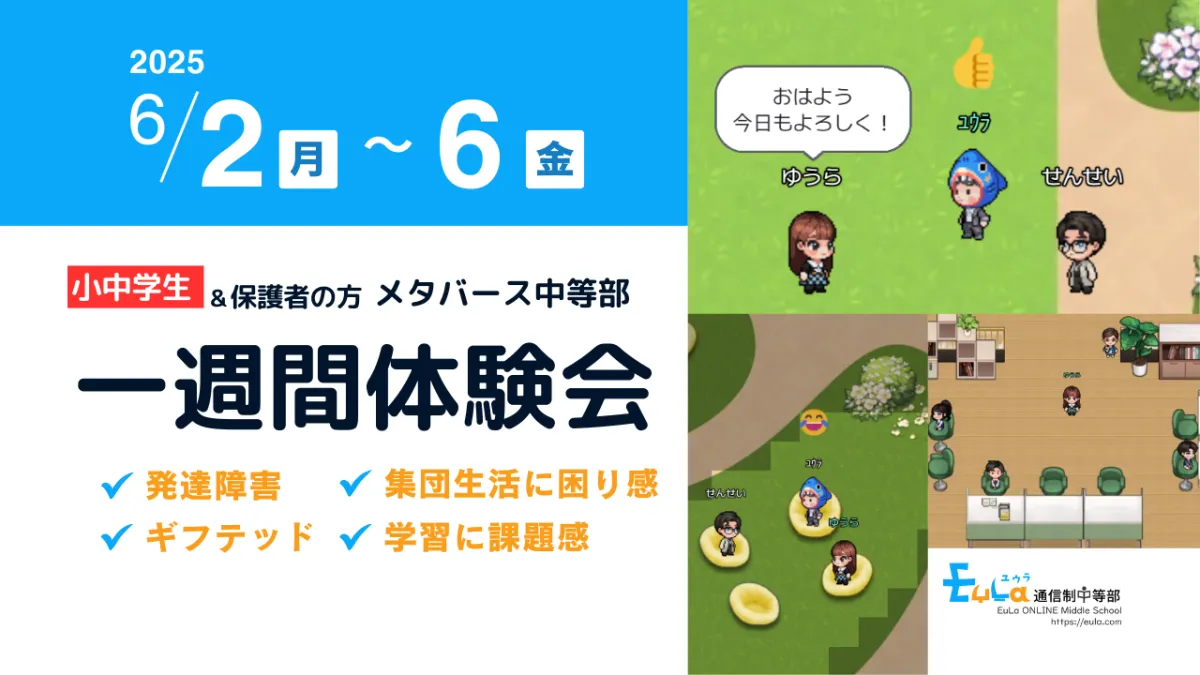 2025年6月2日から6月6日までの5日間、株式会社アットマーク・ラーニングが運営する「EuLa通信制中等部」では、1週間の無料体験入学を開催します。このプログラムは特に不登校や発達特性のある中学生に向けて開かれ、自宅から気軽に参加できることが特徴です。