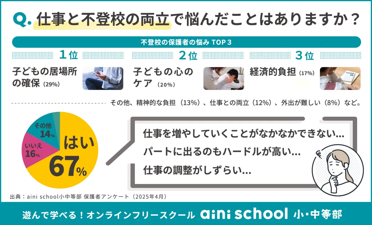 2023年4月に開校したaini school(アイニースクール)では、不登校の子どもを持つ保護者に向けて実施されたアンケート調査の結果が発表されました。この調査によると、約70%の保護者が「仕事との両立に悩んだ経験がある」と回答しています。