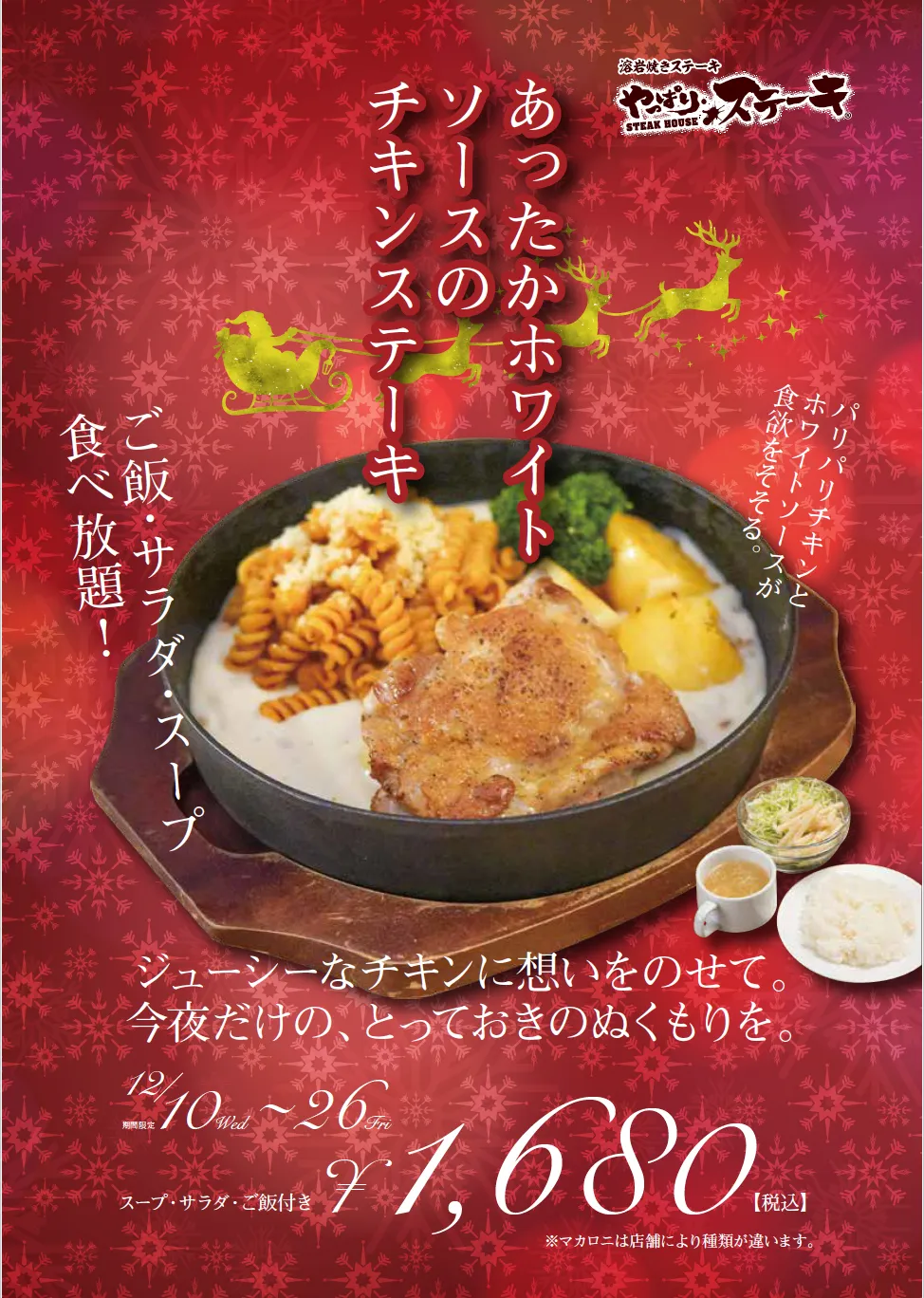 沖縄で多くのファンに愛されている「やっぱりステーキ」が、この冬にぴったりな新メニューをお届けします。寒い季節にこそ味わいたい、心も体も温まる「あったかホワイトソースのチキンステーキ」が登場します!