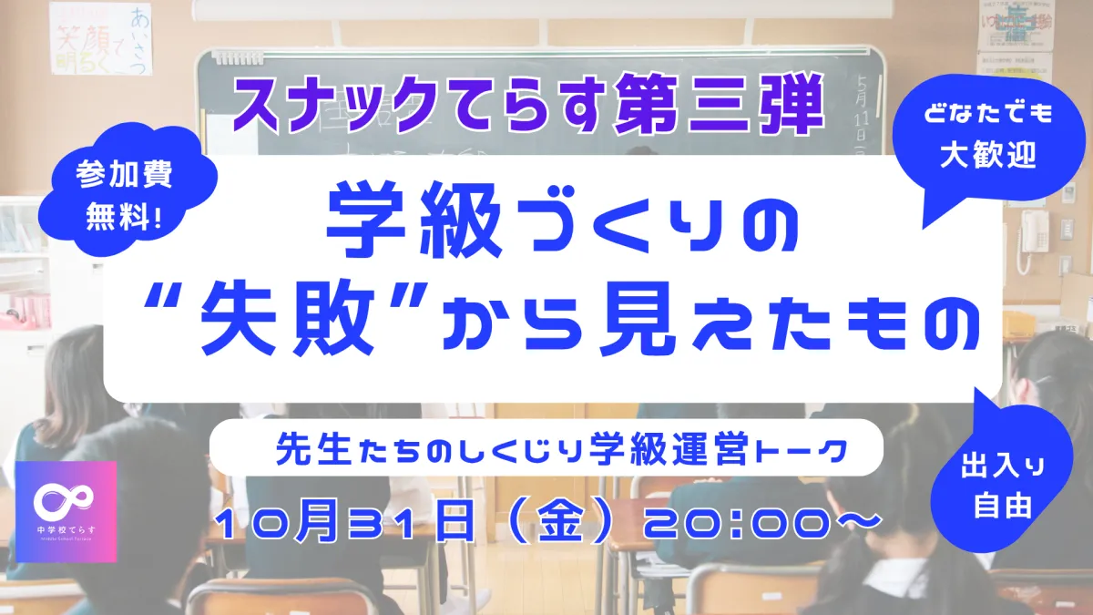 10月31日(金)20:00から、「スナックてらす第三弾」のオンラインイベントが開催されます。今回のテーマは、「学級づくりの“失敗”から見えたもの〜先生たちのしくじり学級運営トーク〜」です。