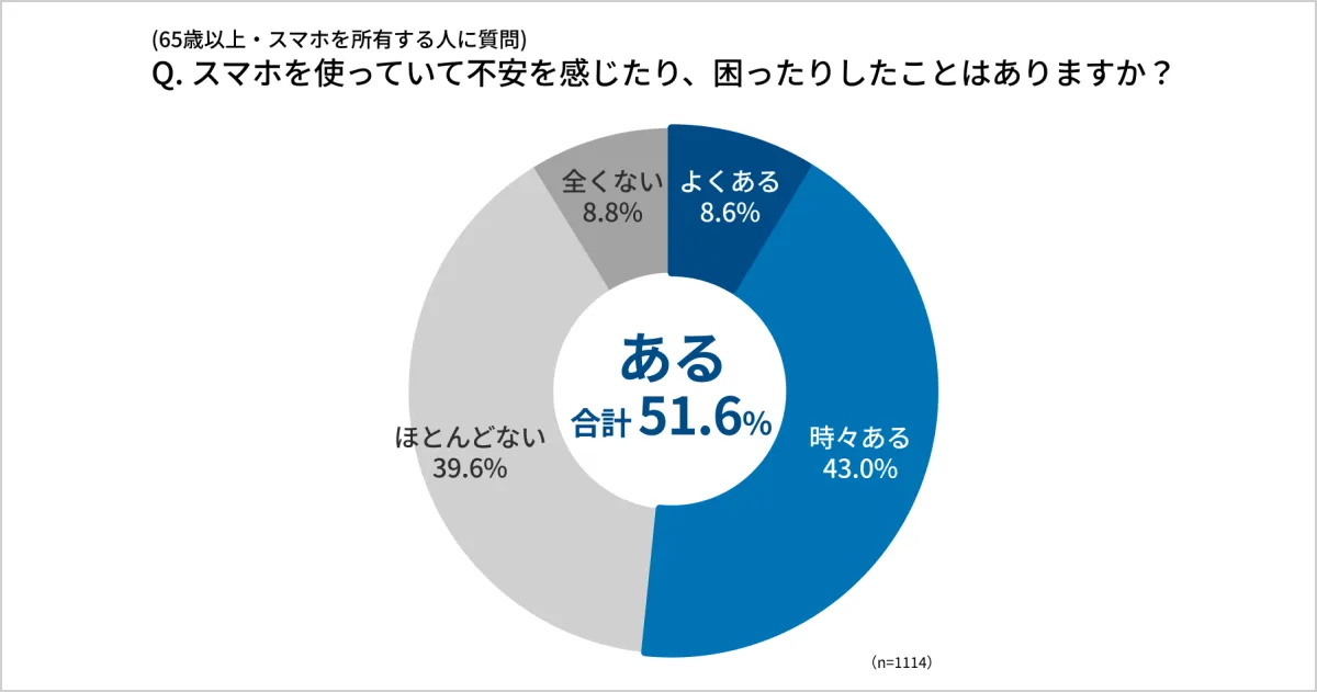 調査から、51.6%の高齢者がスマホ利用にあたり何らかの不安や問題を経験したと回答しています。特に多く報告されたトラブルには、「不審な電話」が86.1%、「不審なSMS・メール」が62.1%と高い割合を占めています。これにより、高齢者が詐欺などの被害に遭うリスクが常に存在することがわかります。