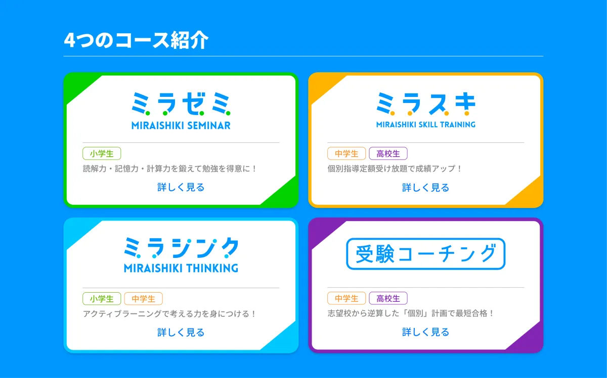 「ミライ式」ブランドのもとに設けられた4つのコースは、それぞれ異なる学習ニーズに応じたプログラムを提供しています。以下に各コースの特徴を詳しく紹介します。