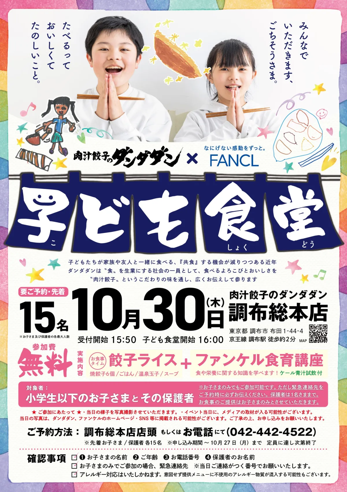 肉汁餃子のダンダダンが、食育に力を入れる株式会社ファンケルと共同で「子ども食堂」を開催します。このイベントは2025年10月30日(木)に東京都調布市にあるダンダダン調布総本店にて行われ、小学生以下のお子様とその保護者のための特別な食事体験となります。