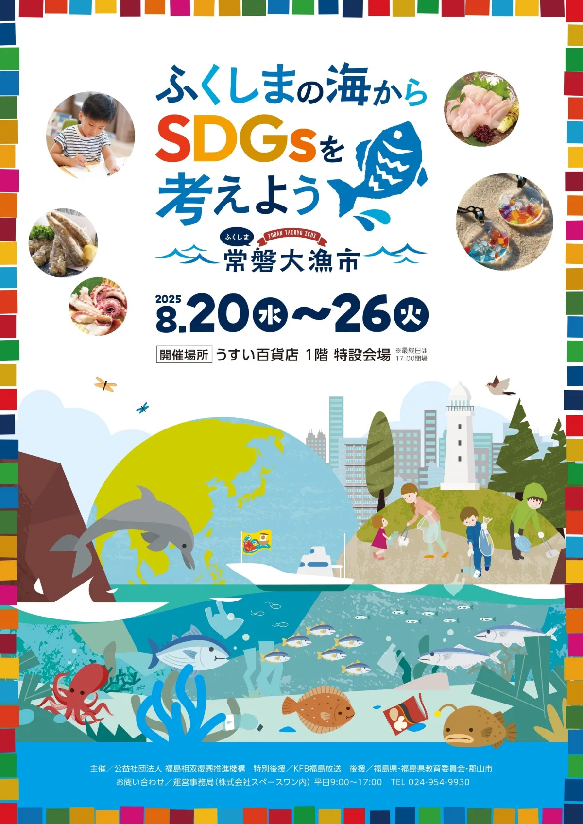 福島県郡山市にて、2025年8月20日から26日まで「ふくしま常磐大漁市inうすい百貨店」が開催されます。このイベントは、親子で楽しみながら、福島の海の環境や資源について学ぶことができる貴重な機会です。福島の豊かな海の魅力と、現在直面している海の問題を知ることで、子どもたちが将来の海を守る意識を育むことを目指しています。