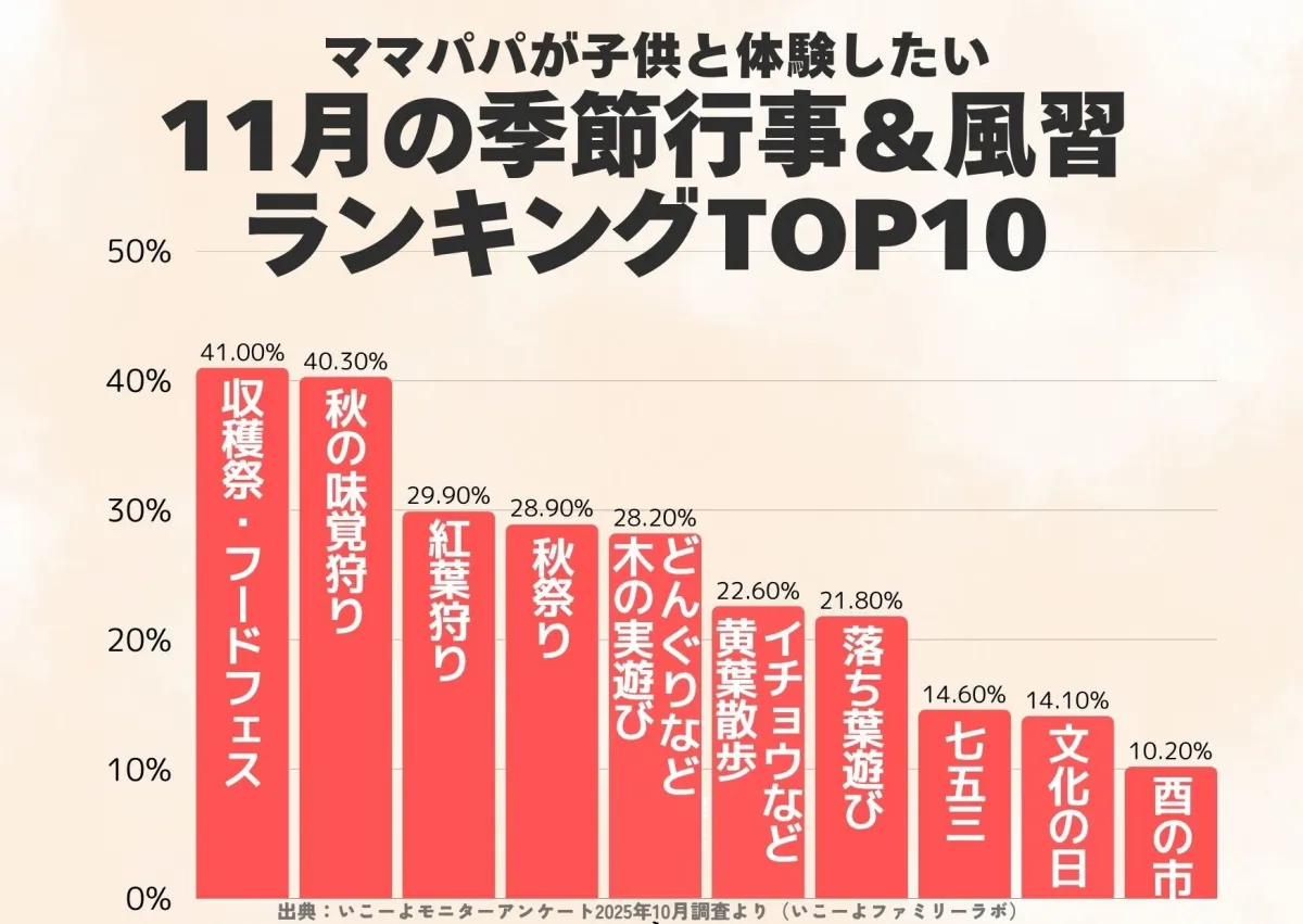 子育て世代のニーズを探る「いこーよファミリーラボ」の調査により、11月に子供と一緒に参加したいイベントが明らかになりました。秋の訪れに伴い、家族での体験を重視する家庭が増えています。具体的には、収穫祭やフードフェスが最も人気を集めており、親子で自然や食に触れる機会が多く求められています。