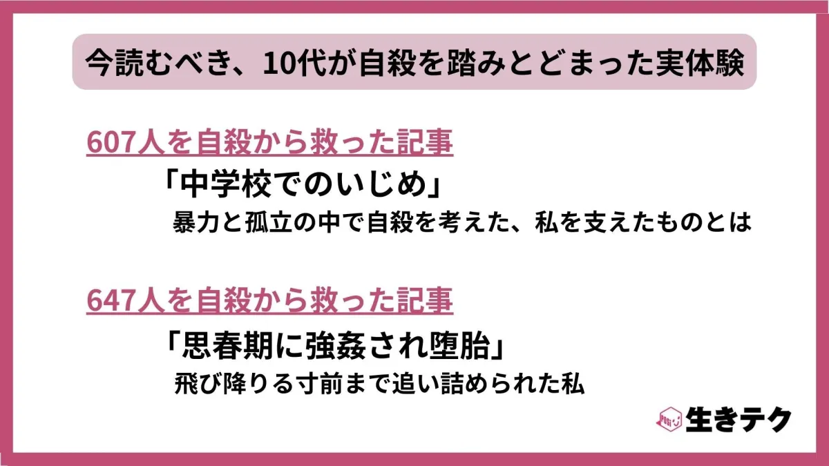 生きテクは、これまでに自殺を踏みとどまった約28,750人の声を集め、その中から特に反響の大きかった体験談を選定しています。多くの人々が、自らの困難を乗り越えるためのヒントや支えになった事象について語っており、これが多くの人に希望を与える要因となっています。