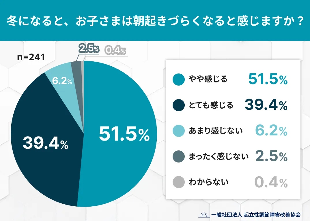 寒さが増す冬の朝、子どもたちの身支度にかかる時間は、春や秋に比べて約1.3倍にも増加します。一般社団法人起立性調節障害改善協会が実施した調査によると、240名以上の保護者が回答し、9割以上が冬になると子どもが起きづらくなっていると感じていることが明らかになりました。