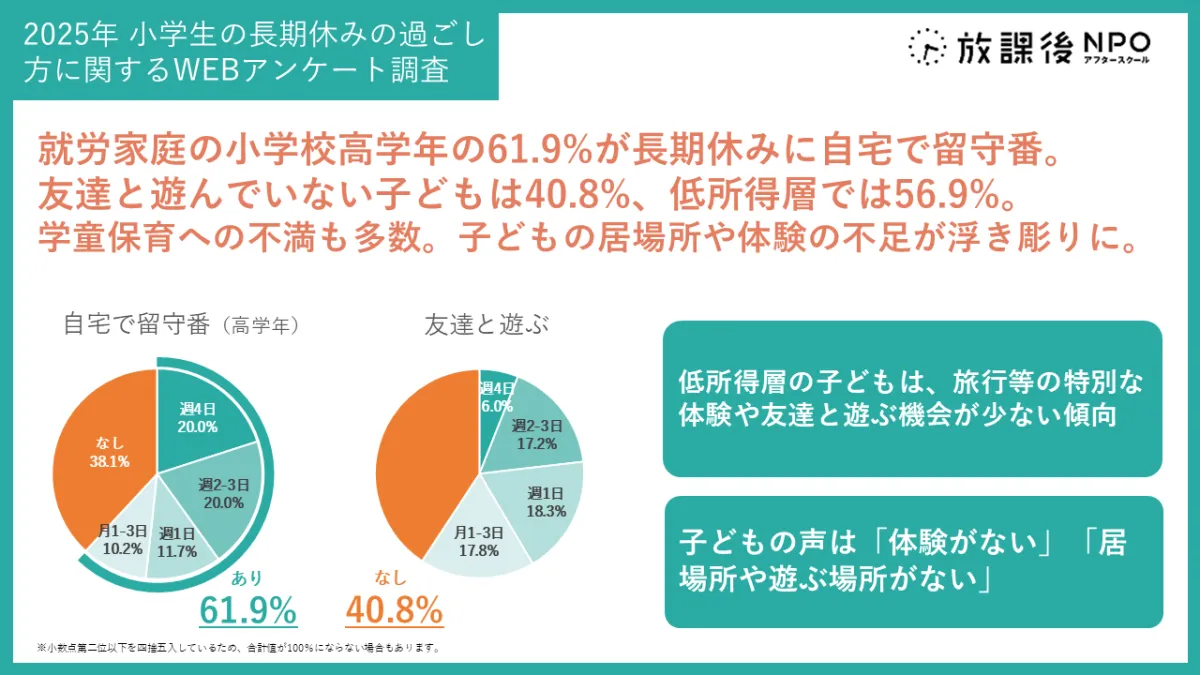 特定非営利活動法人「放課後NPOアフタースクール」が実施した調査では、小学生の長期休みの過ごし方が浮き彫りになりました。調査は東京都文京区に本部を置くこの団体が、就労家庭に属する小学生のおよそ1200名を対象に行ったものです。結果、長期休みに自宅で留守番をしている子どもたちの割合は全体で50.6%、特に高学年では61.9%と高く、学童保育への不満の声も多く寄せられています。