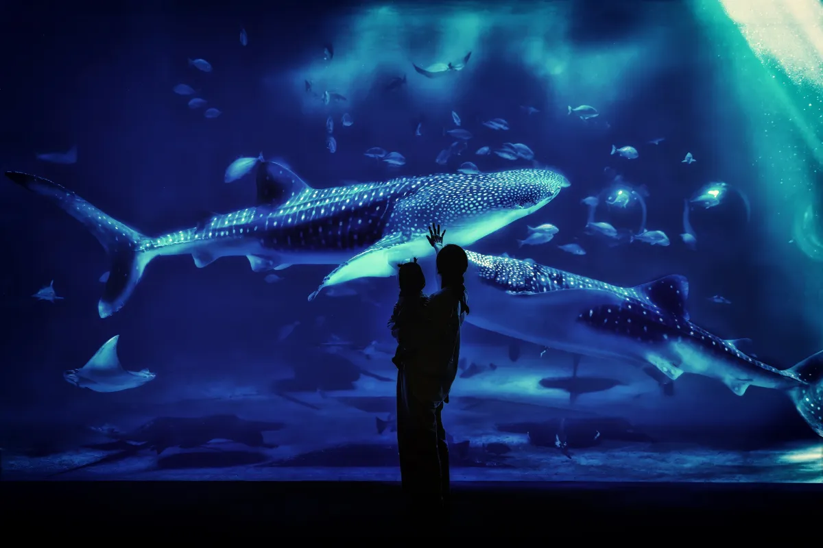 受賞作品は、地震によって命を落としたジンベエザメ、「ハチベエ」と「ハク」の姿を捉えたものです。写真には、ガラス越しに見える家族のシルエットと2匹のジンベエザメの雄大な姿が重なっています。この瞬間は、身近に感じた命の偉大さと、失ったものへの追悼の意が一体となっています。
